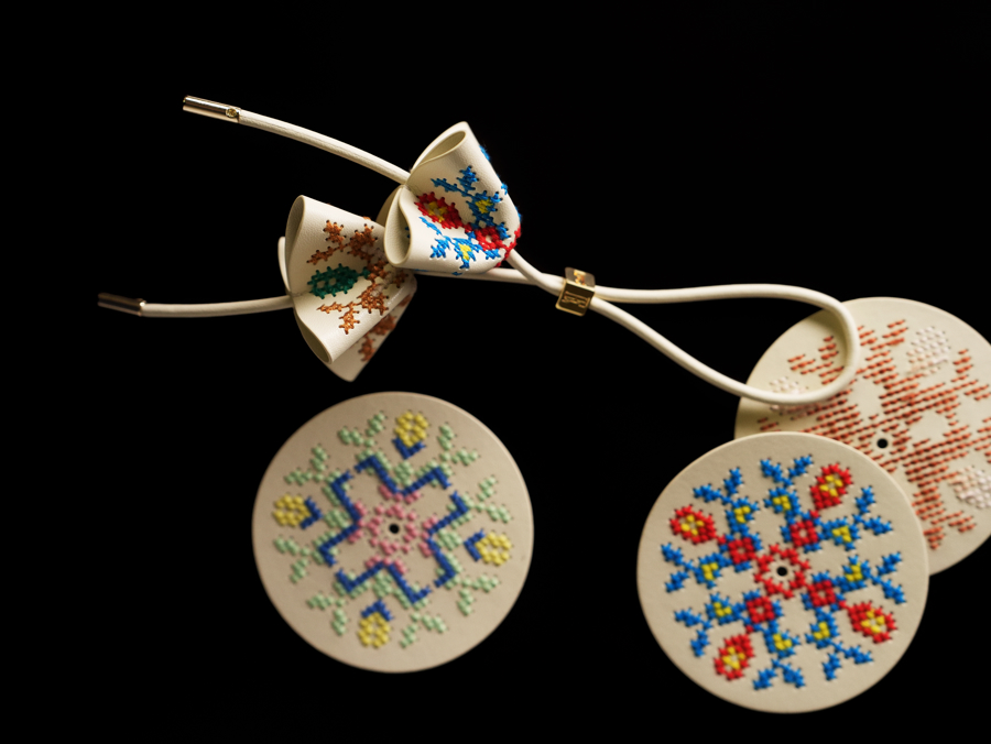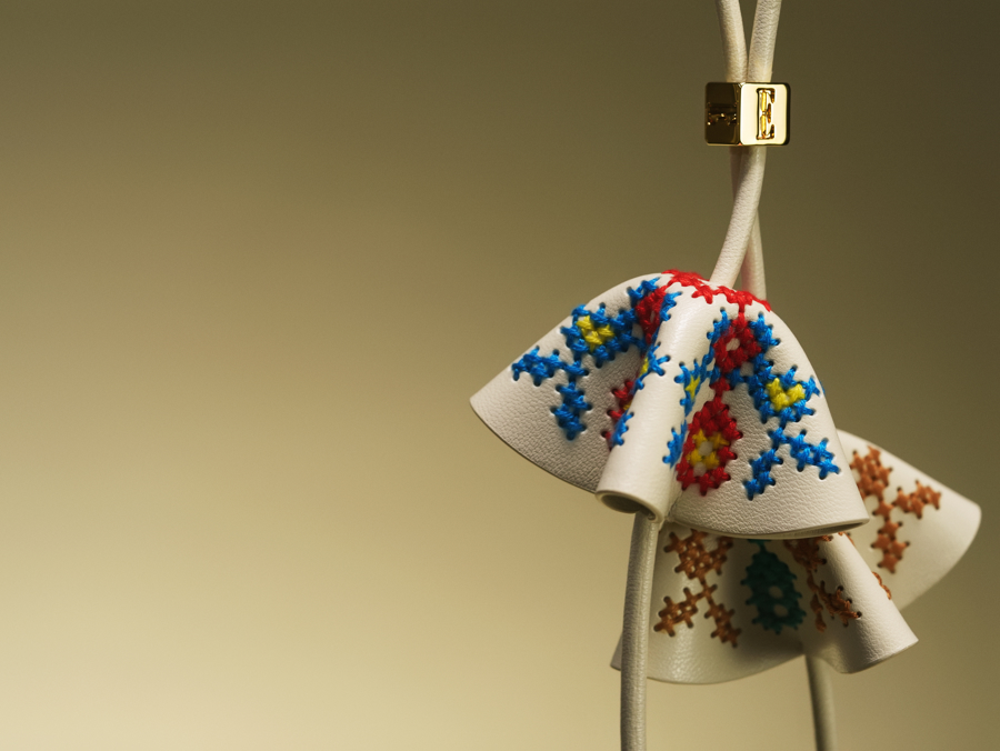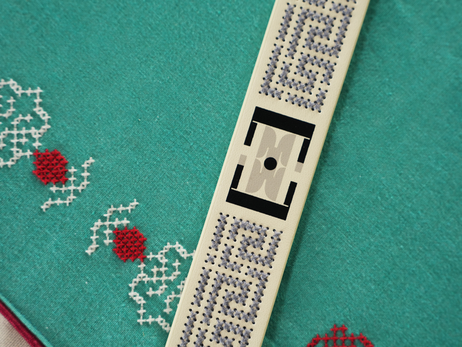 与品牌合作,不仅要埋头钻研技艺,还得了解市场接受度。“ELLE包袋配饰的主要受众是年轻女性,我们要摸清她们会愿意为什么样的故事买单。”郑晓蓉表示,在多番比对后,包挂选用了萱草纹样和铃兰花形,撞色设计刚柔并济,将春日的祝福藏在细腻的手工里。萱草被称作“忘忧草”,承载着对安康顺遂的祈愿;铃兰则以其清逸的姿态,寓意幸福归来,罗泾十字挑花技艺以针线为笔,将纹样一针一针挑入,萱草舒展,铃兰低垂,行走时轻轻摇曳,仿佛让忧思随风散去。融入传统回纹的肩带,则悄悄藏进“E”字品牌符号,既藏着福寿绵长的东方寓意,又透着国际时尚的极简大气。